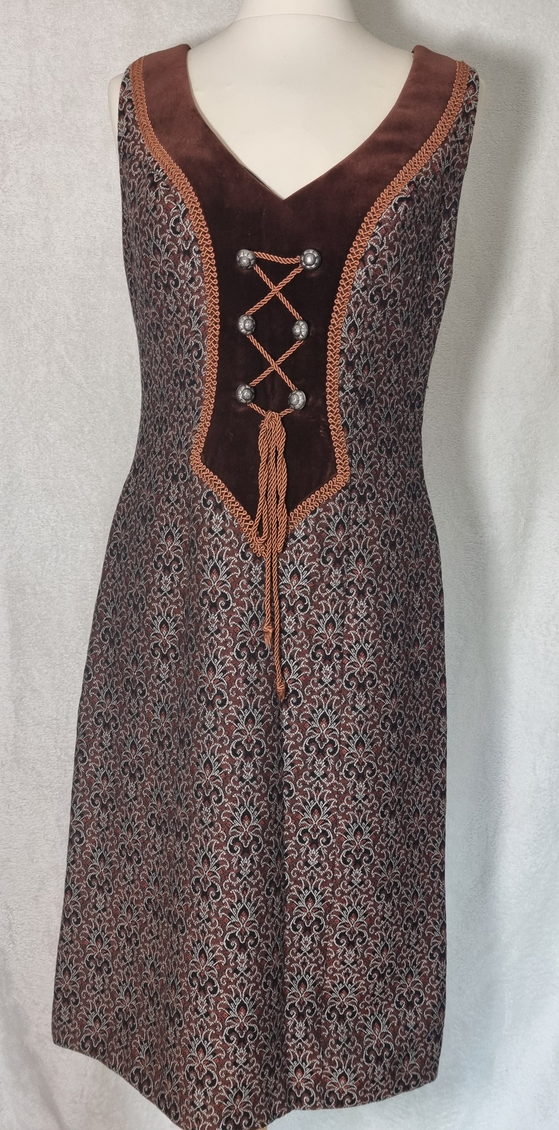 Hochwertige Stoffe, gewebt mit Muster, sowie Samt und Bortenverzierungen. Gefüttert mit schwarzem Unterrock mit Spitzensaum.