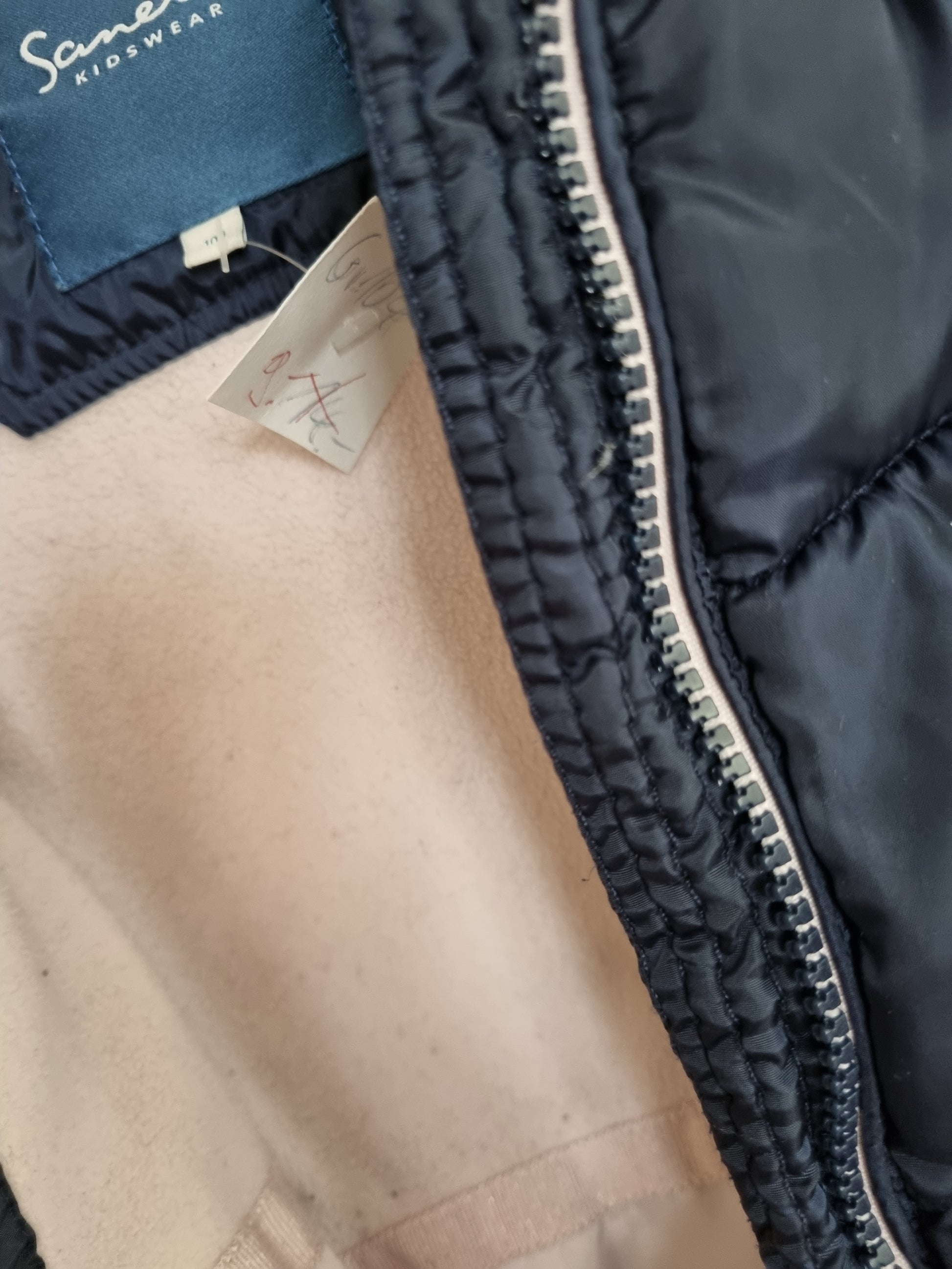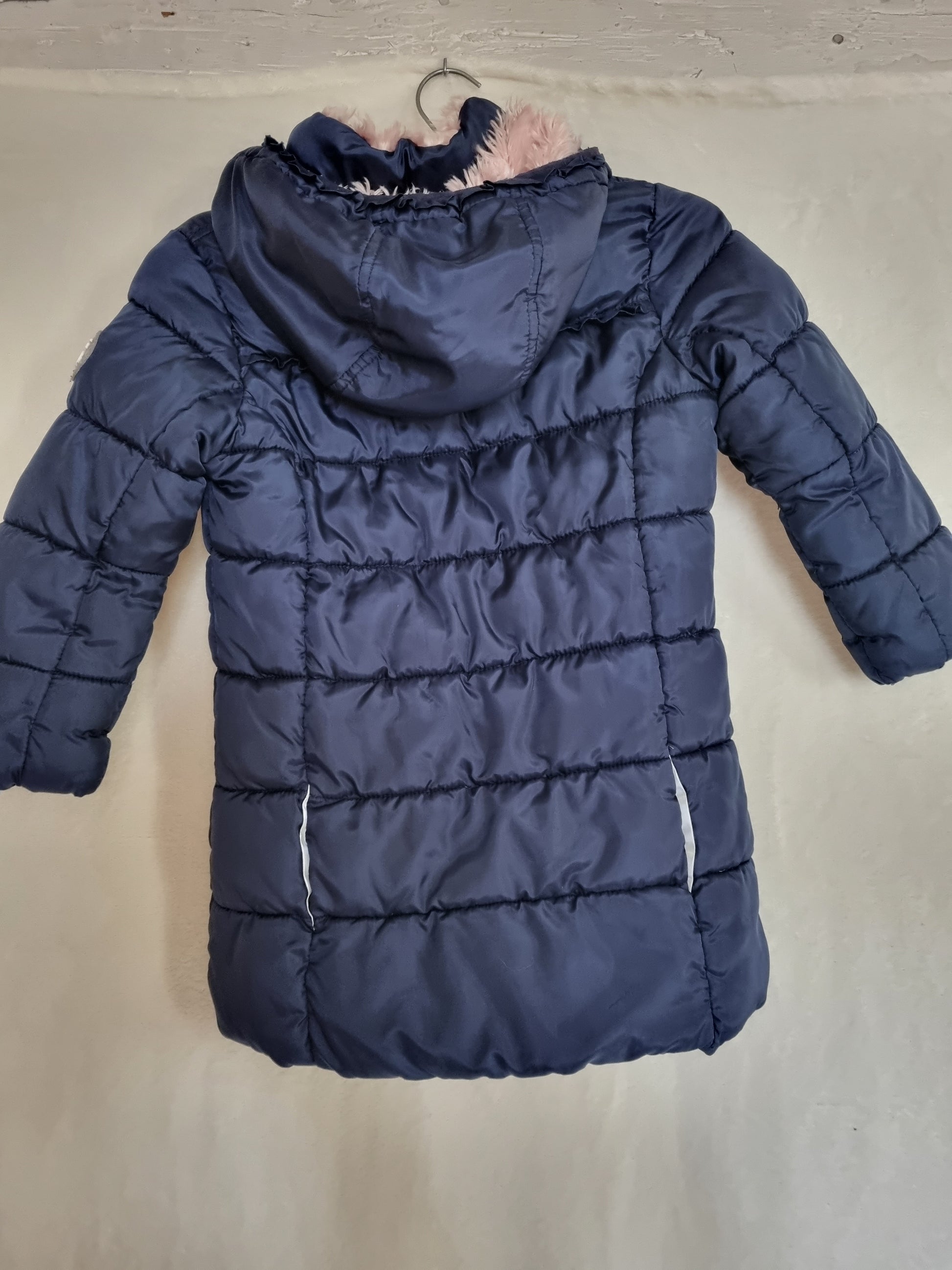 Süßes Mäntelchen in dunkelblau. Innen im oberen Bereich mit Fleece gefüttert, hält schön warm! Kapuze mit rosa Teddyplüsch gefüttert.